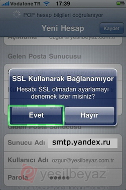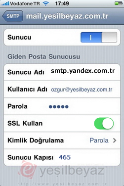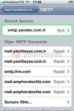 Birincil Sunucu altında bulunan smtp.yandex.com.tr şeklindeki adrese girin