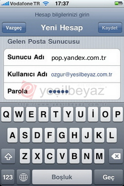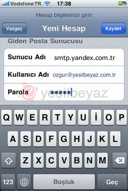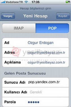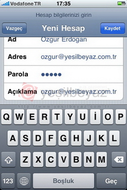 Ad, Adres, Parola ve Açıklama alanlarınız E-Mail hesabı bilgilerinize göre girin ve "Kaydet" butonuna basarak kaydedin